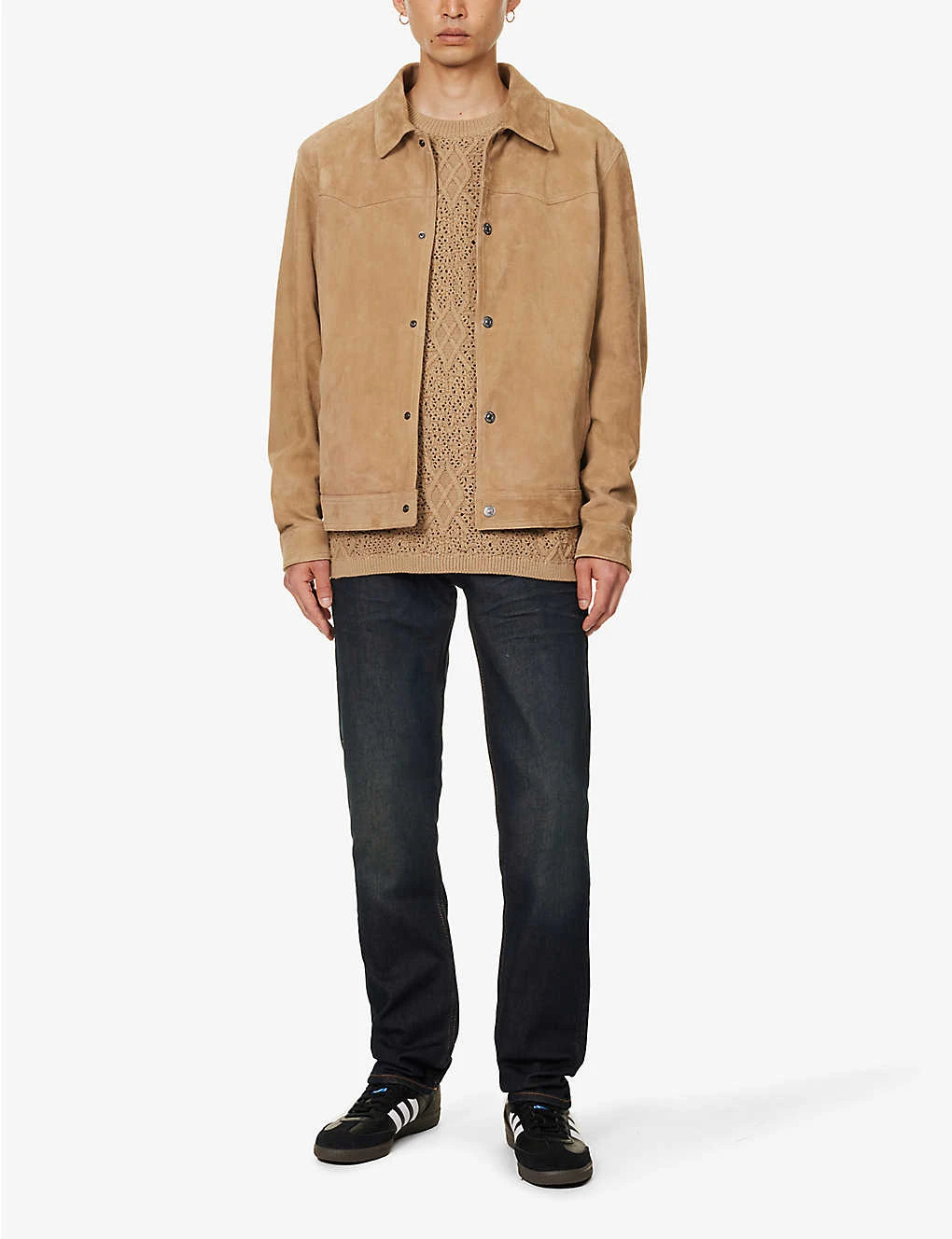 - Regular fit, mid-rise, straight leg, belt loops, five pockets, contrast stitching, V-shaped yoke at back, branded patch at back, branded hardware