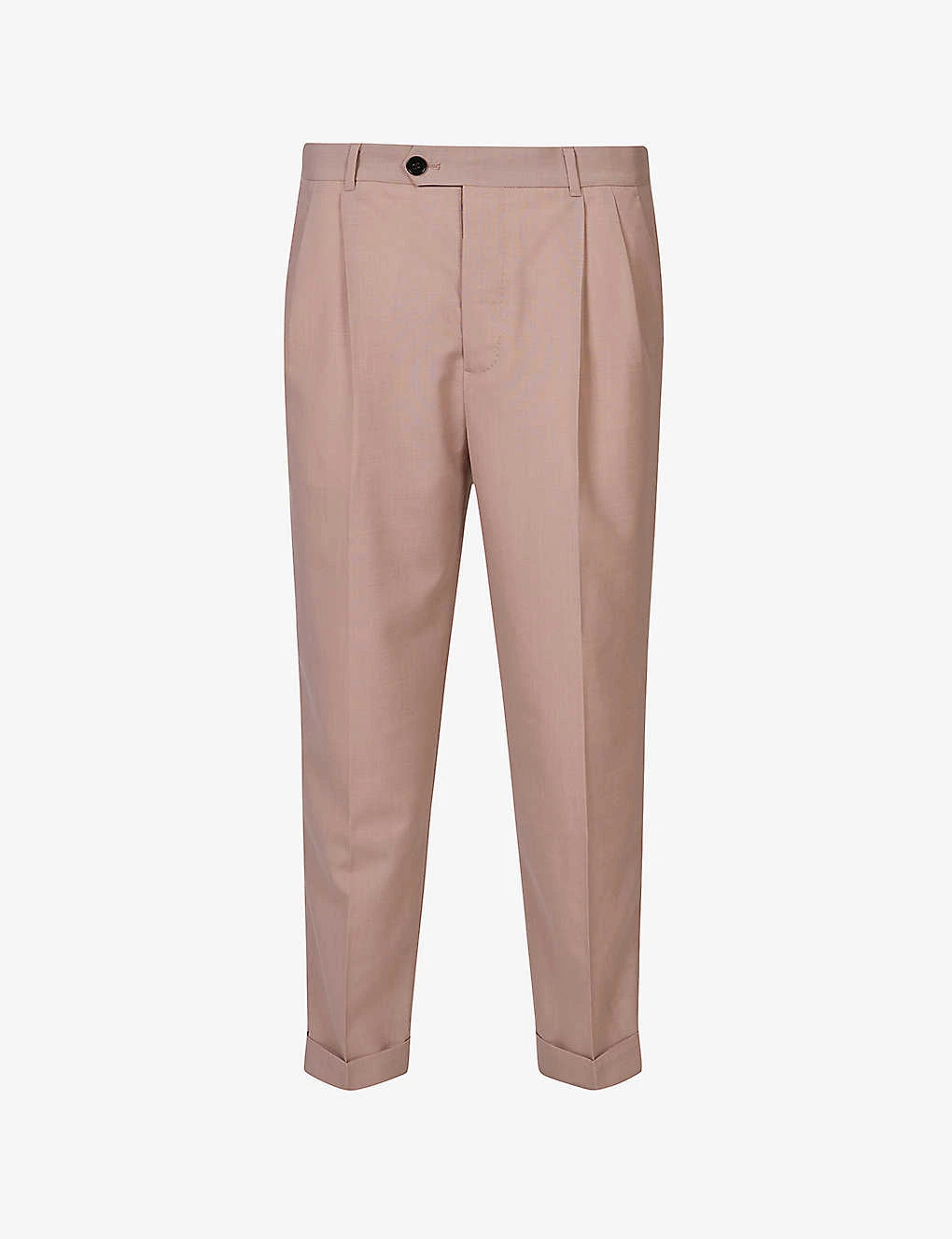 - Regular fit, tapered leg, mid-rise, cropped leg, belt loops, pleating at front, centre pressed crease, two side slip pockets, turned-up cuffs, two back welt pockets