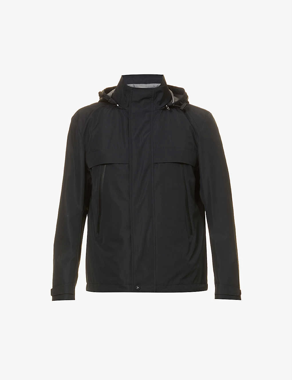 - Detachable drawstring hood, high neck, long sleeves, hook-and-loop cuffs, flap at chest, concealed zipped pockets at front, water resistant, lightweight, detachable underlay, drawstring hem