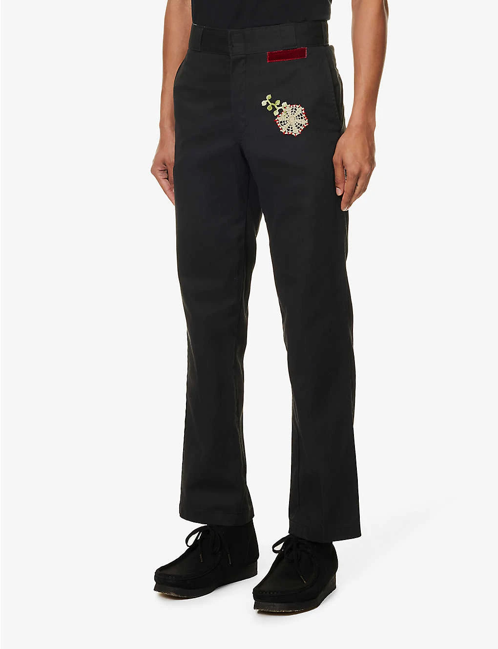 Brand-patch Floral-embroidered Straight-leg Cotton-blend Trousers