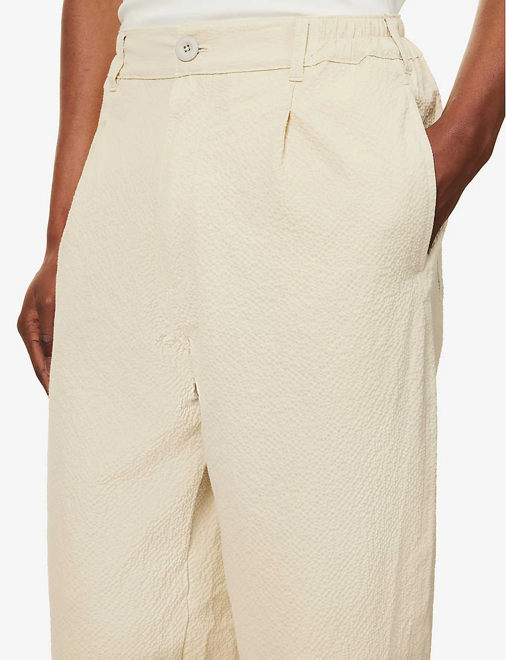 - Relaxed fit, mid-rise, straight leg, belt loops, elasticated waist, two knife pleats at front, two slip pockets at sides, two patch pockets at back, seersucker texture, partially lined