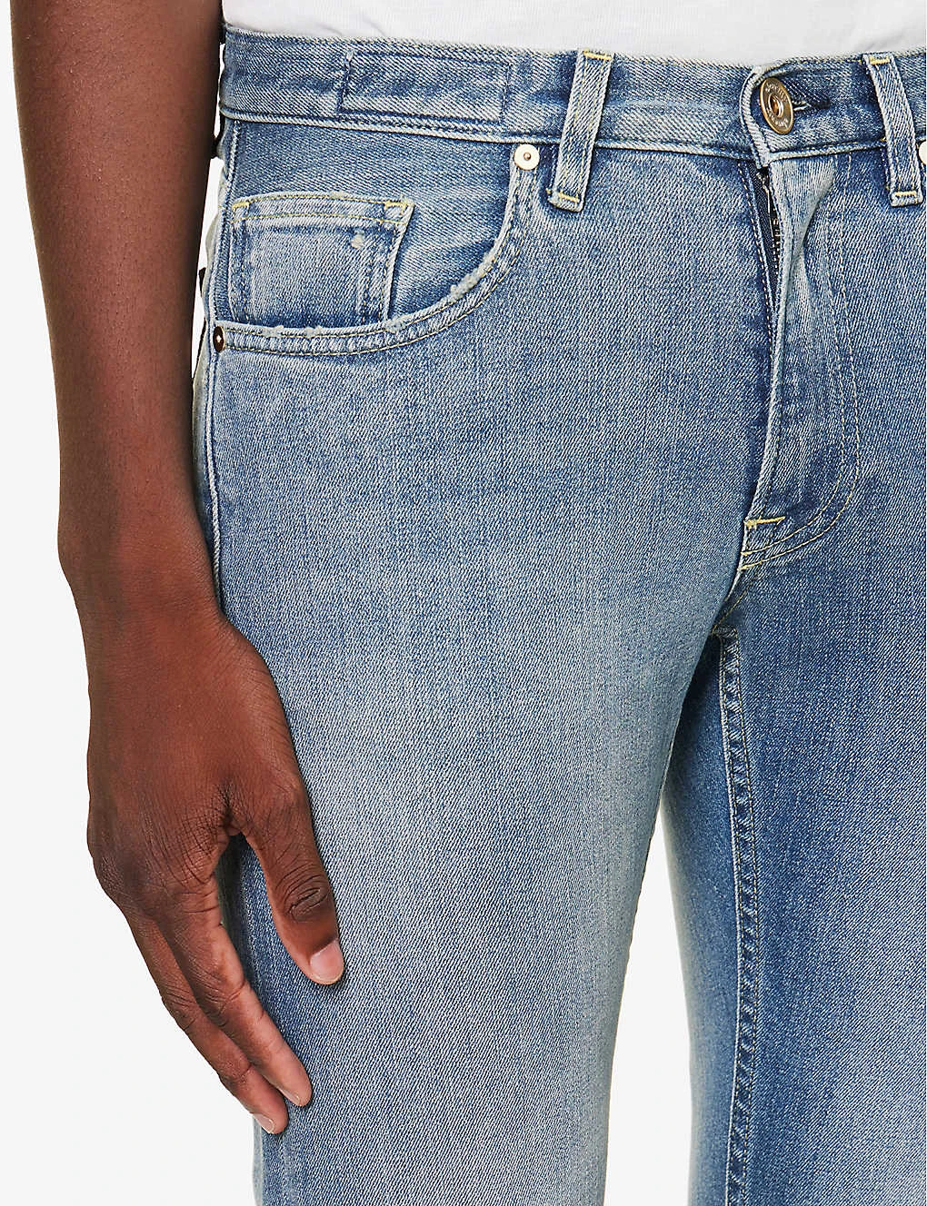 - Slim fit, mid-rise, tapered leg, belt loops, five pockets, contrast patch at back, branded at back, faded wash, branded hardware, distressed trims
