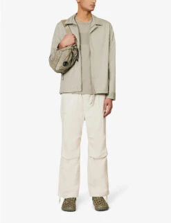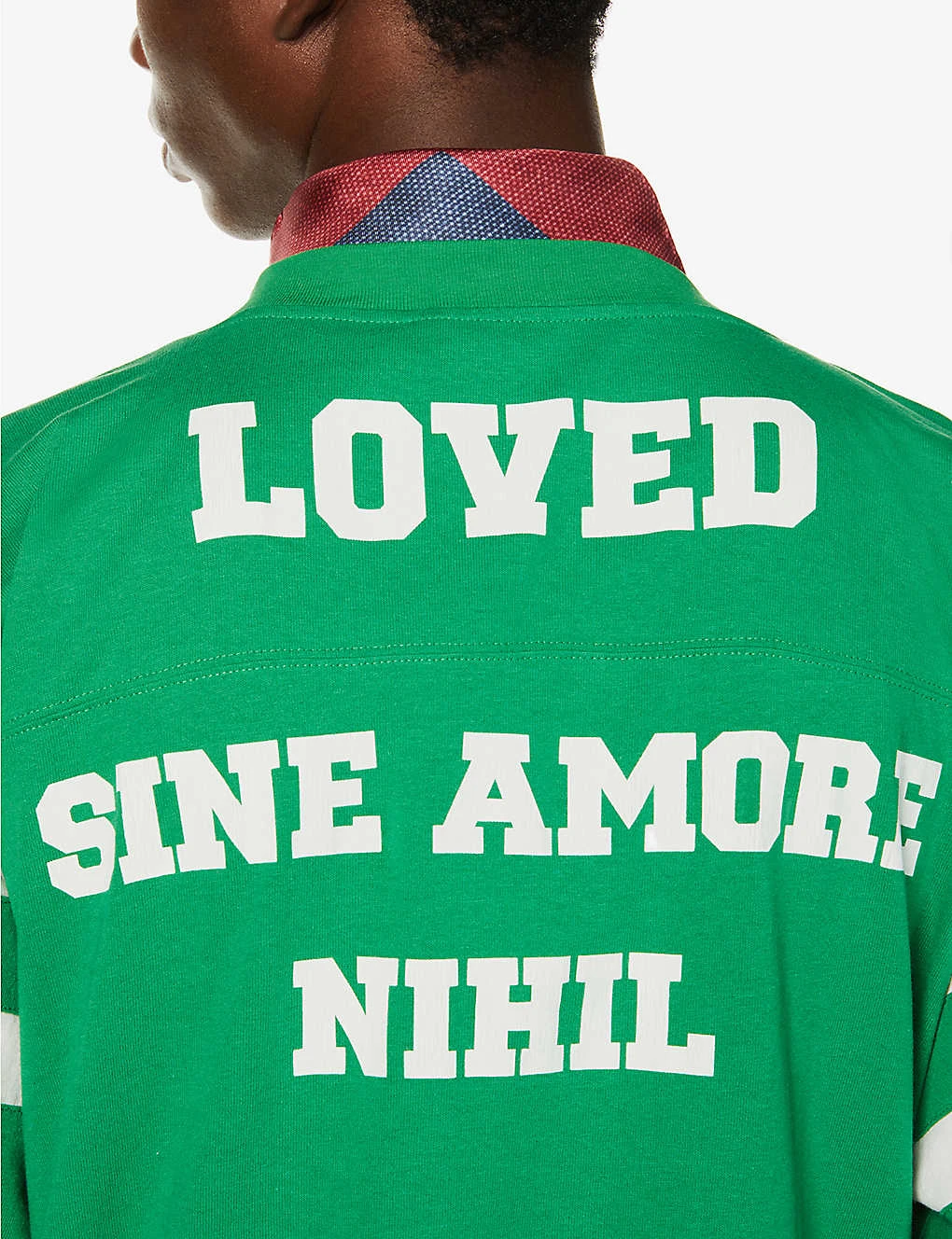- Crewneck, short sleeves, striped pattern at sleeves, branded text print at front and back, relaxed fit