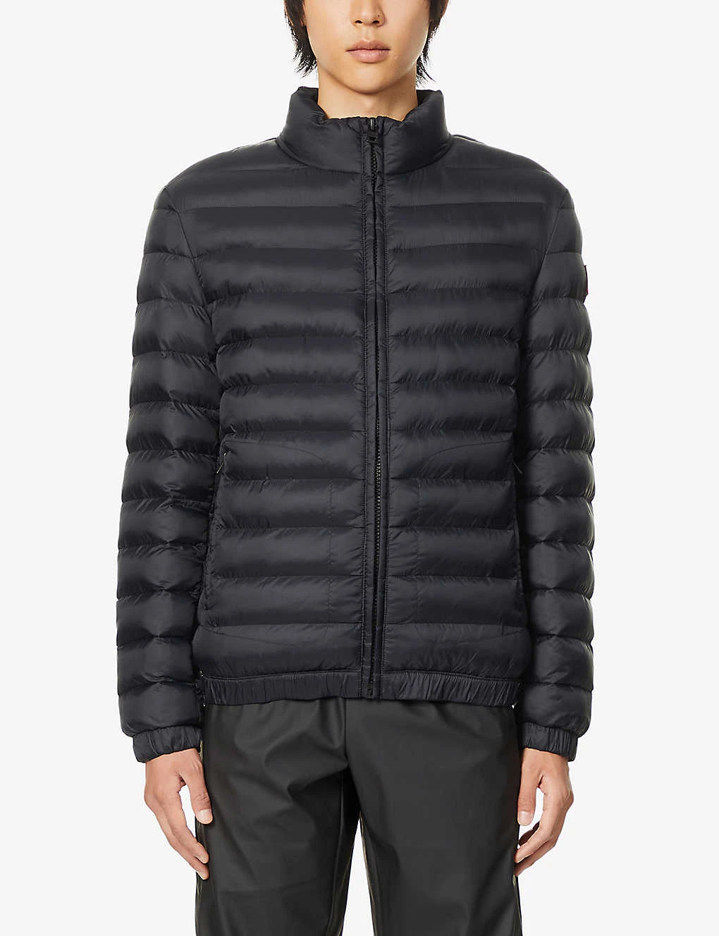 - High neck, long sleeves, branded patch at sleeve, elasticated cuffs, padded, two zipped pockets at front, elasticated hem, fully lined