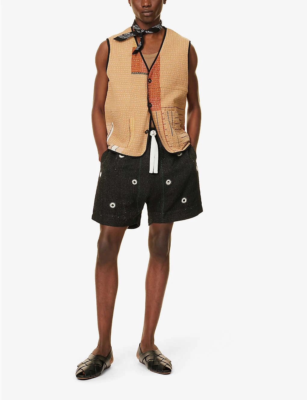 - Relaxed fit, mid-rise, elasticated drawstring waistband, two slip pockets at sides, all-over contrasting panels and top-stitching, all-over mirror embroidery, Kantha quilt, handmade