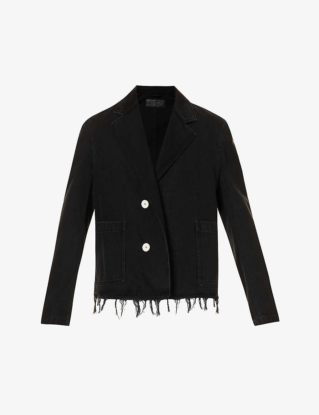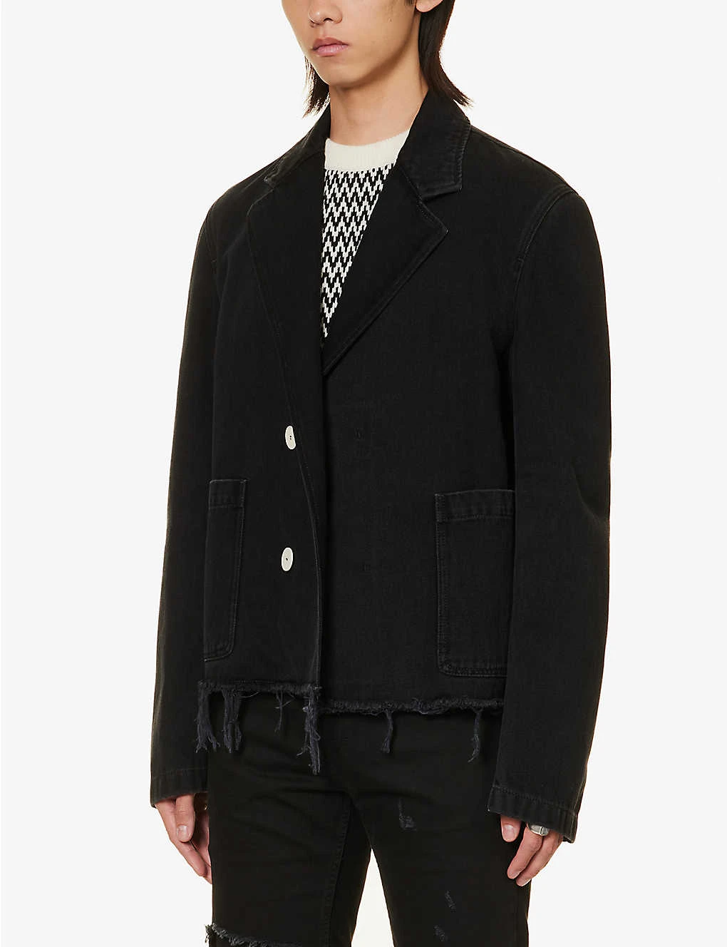 - Relaxed fit, notch lapels, long sleeves, straight cuffs, two patch pockets at front, fringed hem