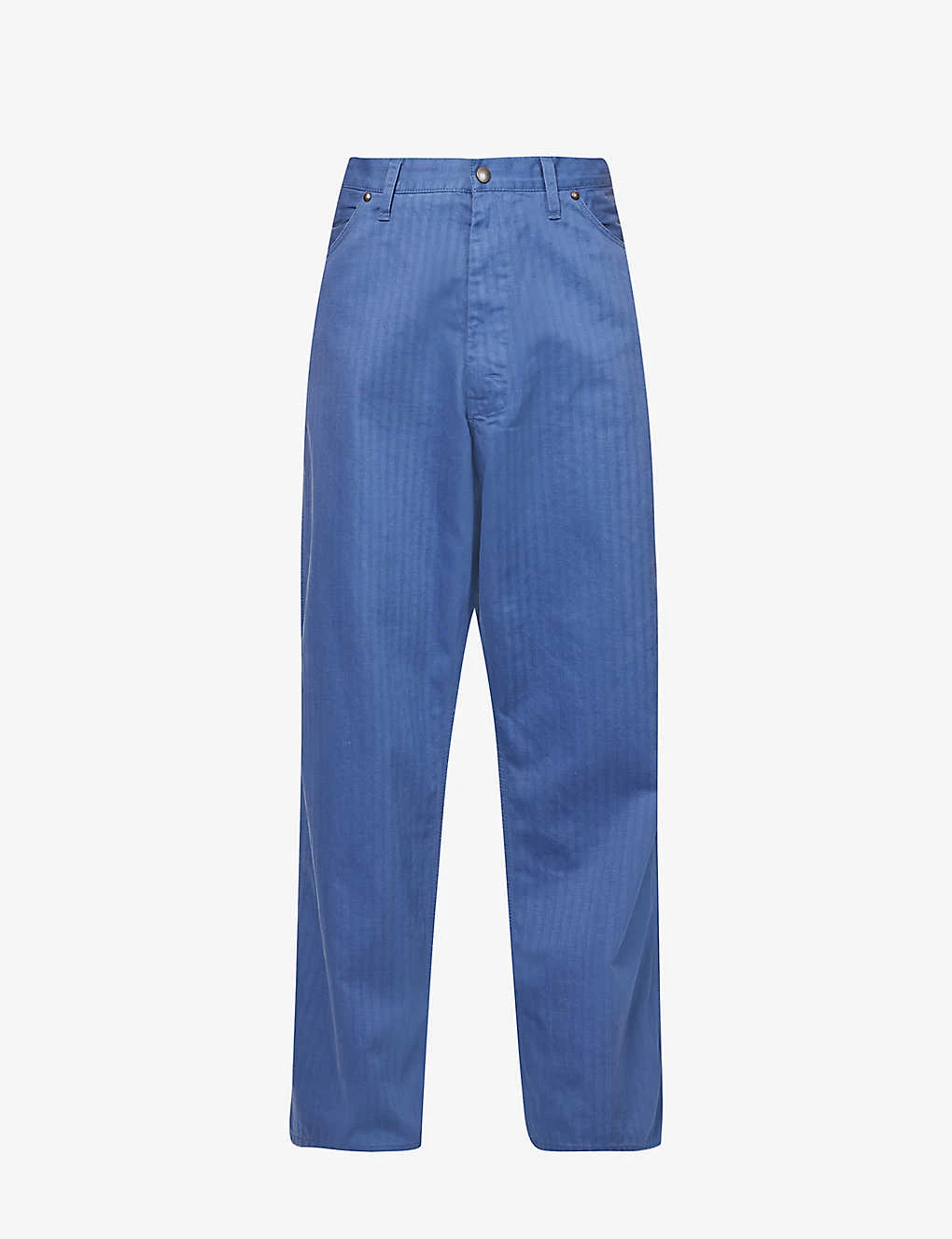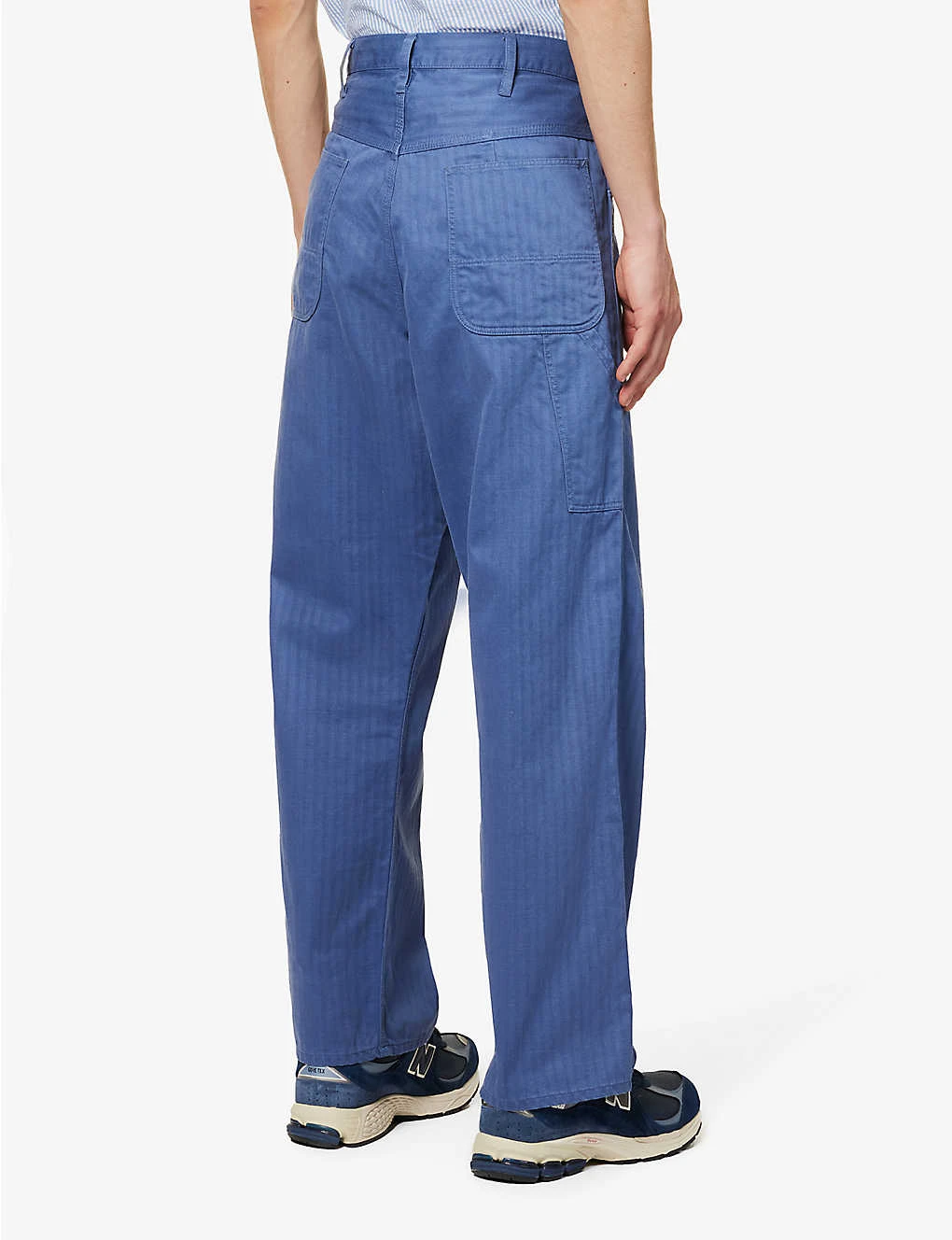 - Regular-fit, mid-rise, wide leg, belt loops, two slip pockets at front, all-over herringbone weave, V-shaped yoke at back, two patch pockets at back, partially lined