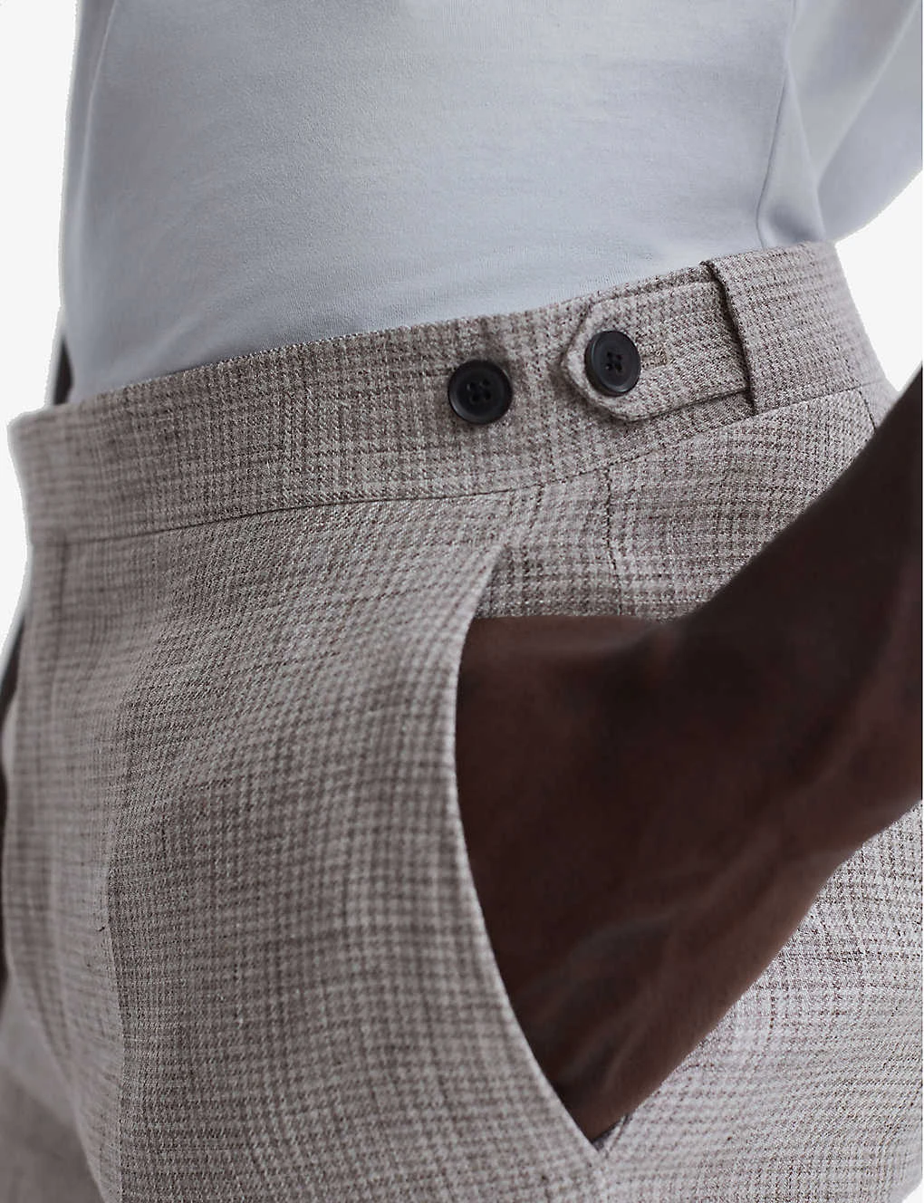 - Slim-fit, straight-leg, mid-rise, structured waistband, buttoned side adjusters, two slip pockets at side, two jetted buttoned pockets at back, all-over checked pattern