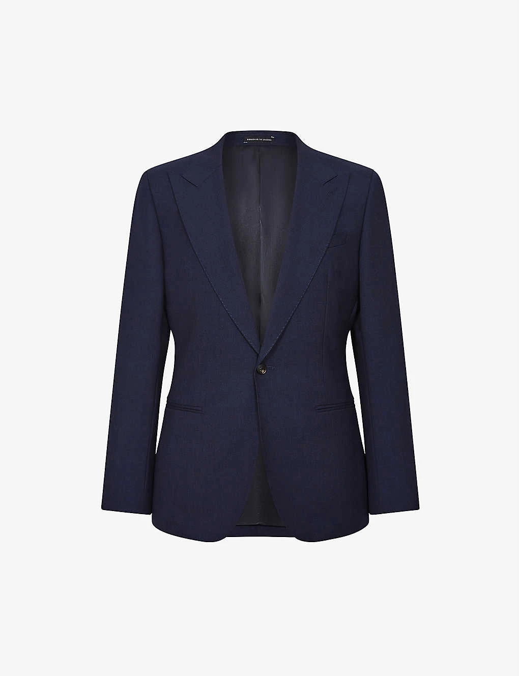 - Peak lapels, single-breasted silhouette, long sleeves, two slip pockets at the side