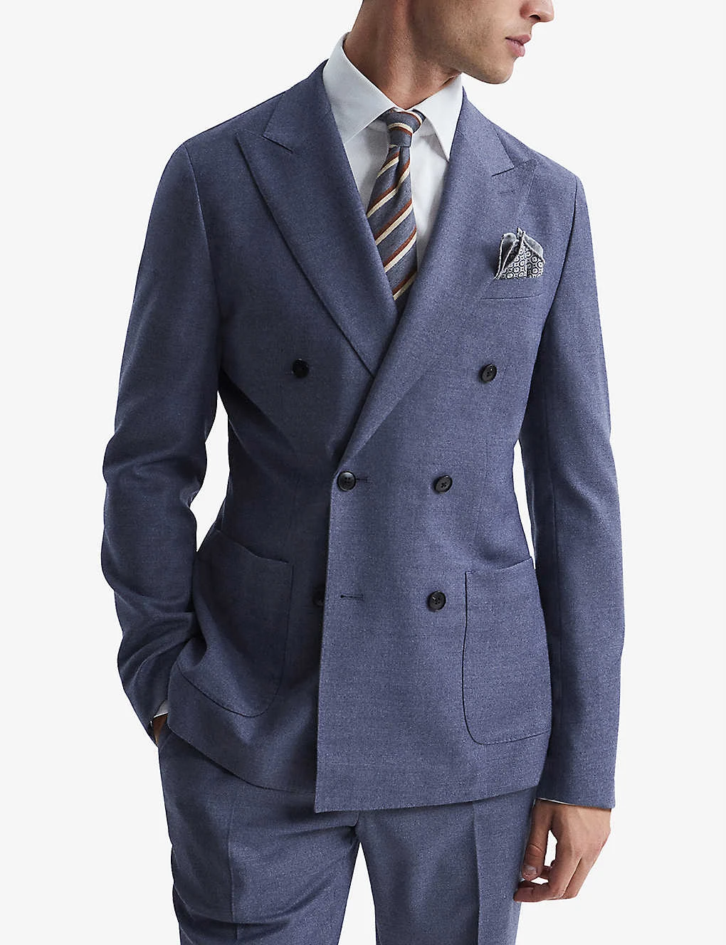 - Slim-fit, peak lapels, long sleeves, buttoned cuffs, double-breasted, textured, welt pocket at chest, patch pockets at front, double vent at back, fully lined