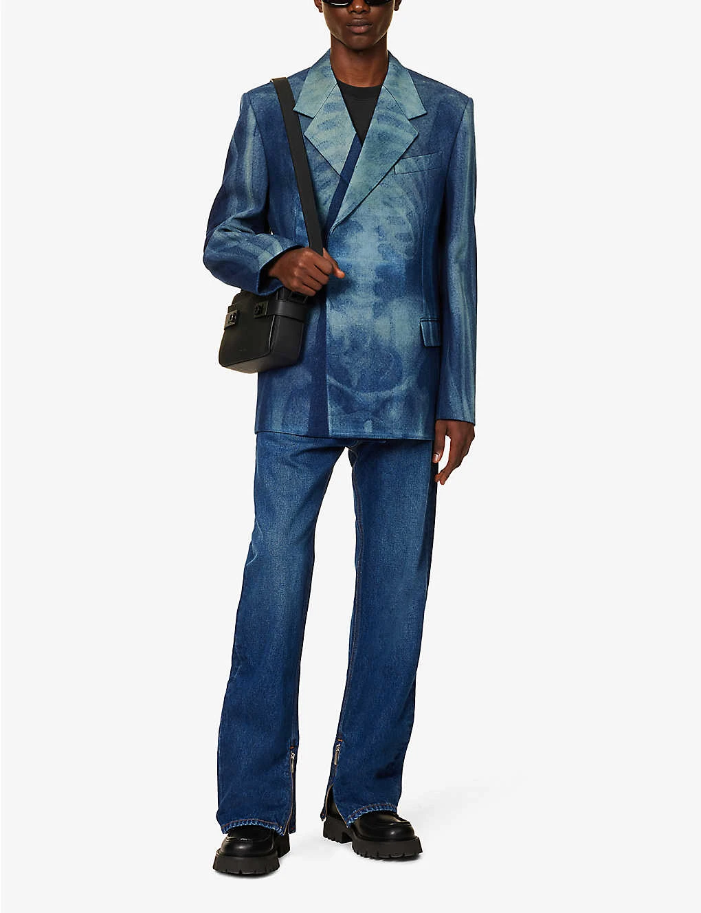 - Regular fit, mid-rise, straight leg, belt loops, five pockets, brand patch at back, contrast stitching, branded hardware, partially lined, zipped hems