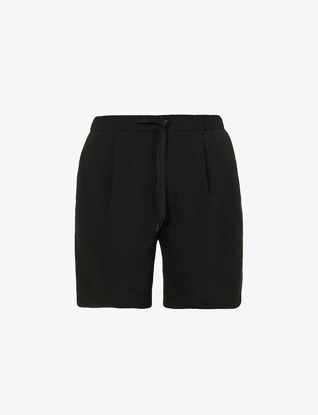 - Regular fit, mid-rise, elasticated drawstring waistband, two slip pockets at sides, pleated at front, zipped pocket at back, brand print at back, branded hardware, partially lined
