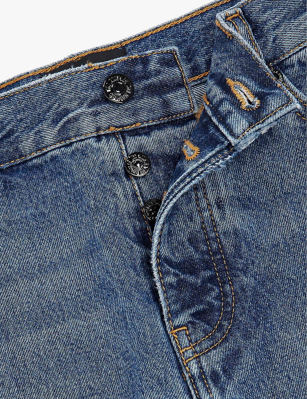 - Mid-rise, regular fit, straight leg, five-pocket design, distressing at the pockets, contrast stitching, whiskering and fading details