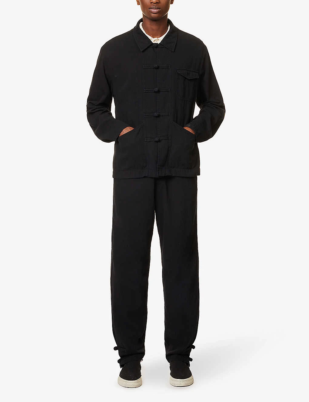 - Relaxed fit, spread collar, long sleeves, buttoned cuffs, buttoned pocket and two slip pockets at front, straight hem