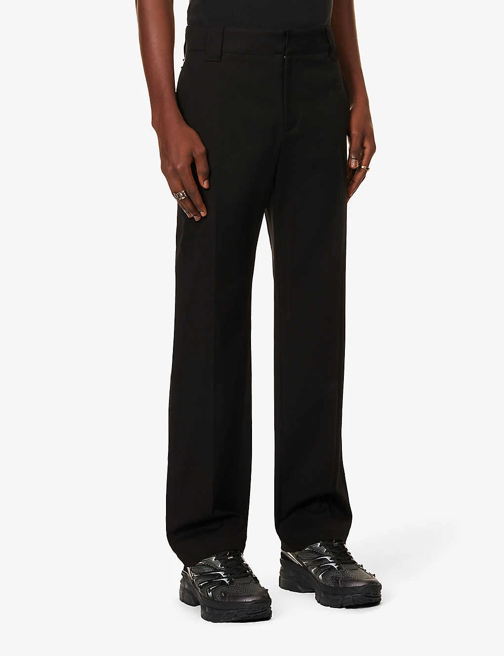 - Regular fit, mid-rise, straight leg, belt loops two slip pockets at sides, pressed centre creases at front and back, stud embellishments at back, darts at back, two welt pockets at back, partially lined